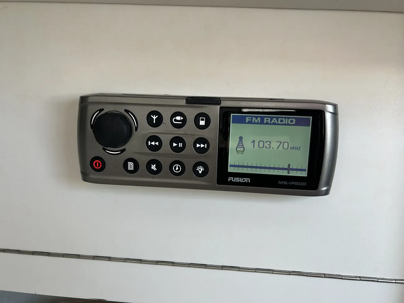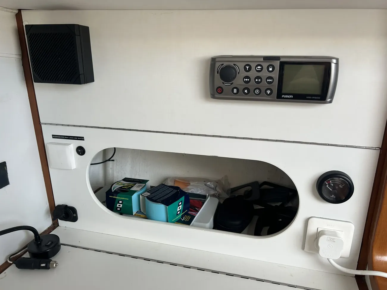 Nav table with 12v switch panel, Raymarine C95 plotter, music & VHF at companionway to cockpit.