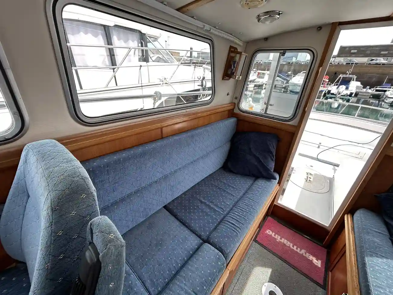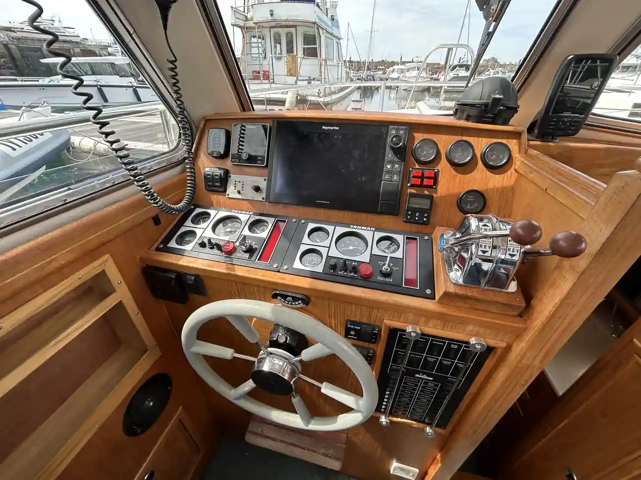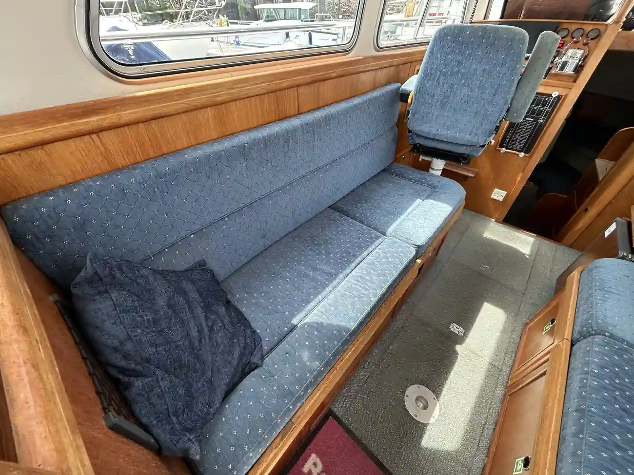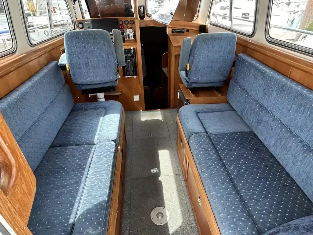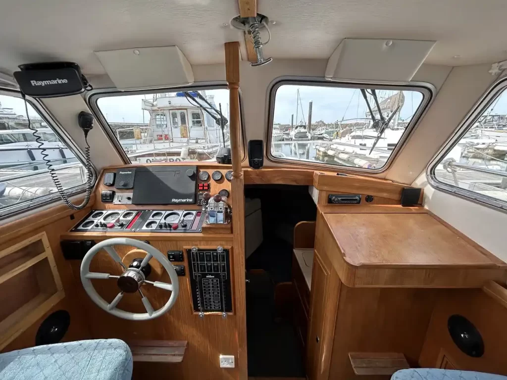 - Spacious Wheelhouse: Fully enclosed with excellent visibility, teak trim, and helm/nav seating