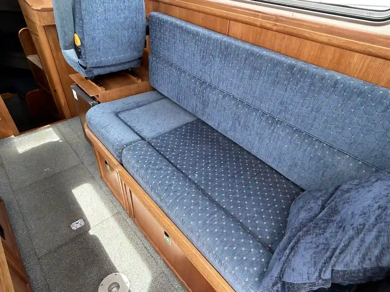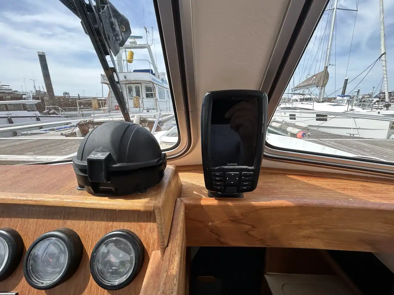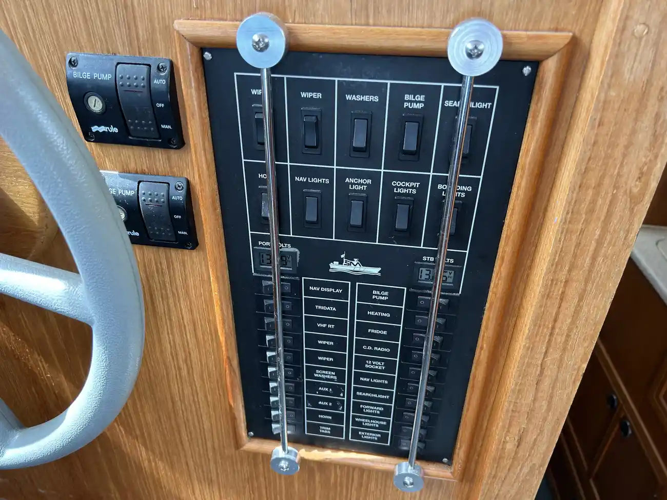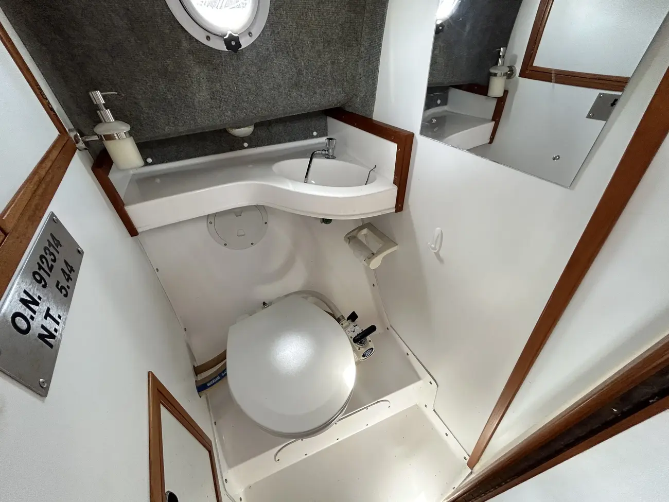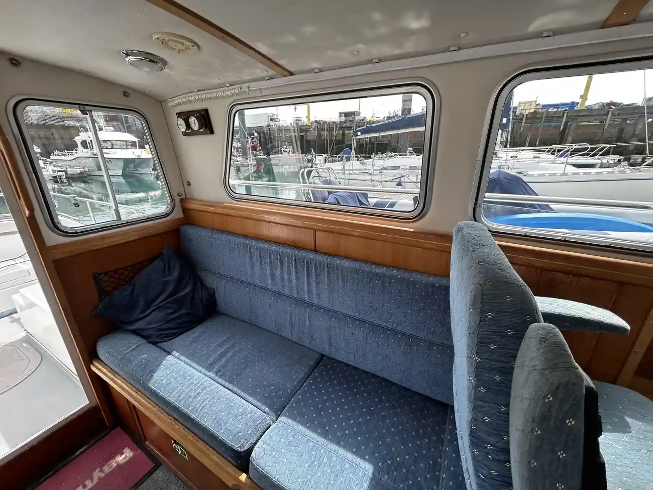 - Spacious Wheelhouse: Fully enclosed with excellent visibility, teak trim, and helm/nav seating