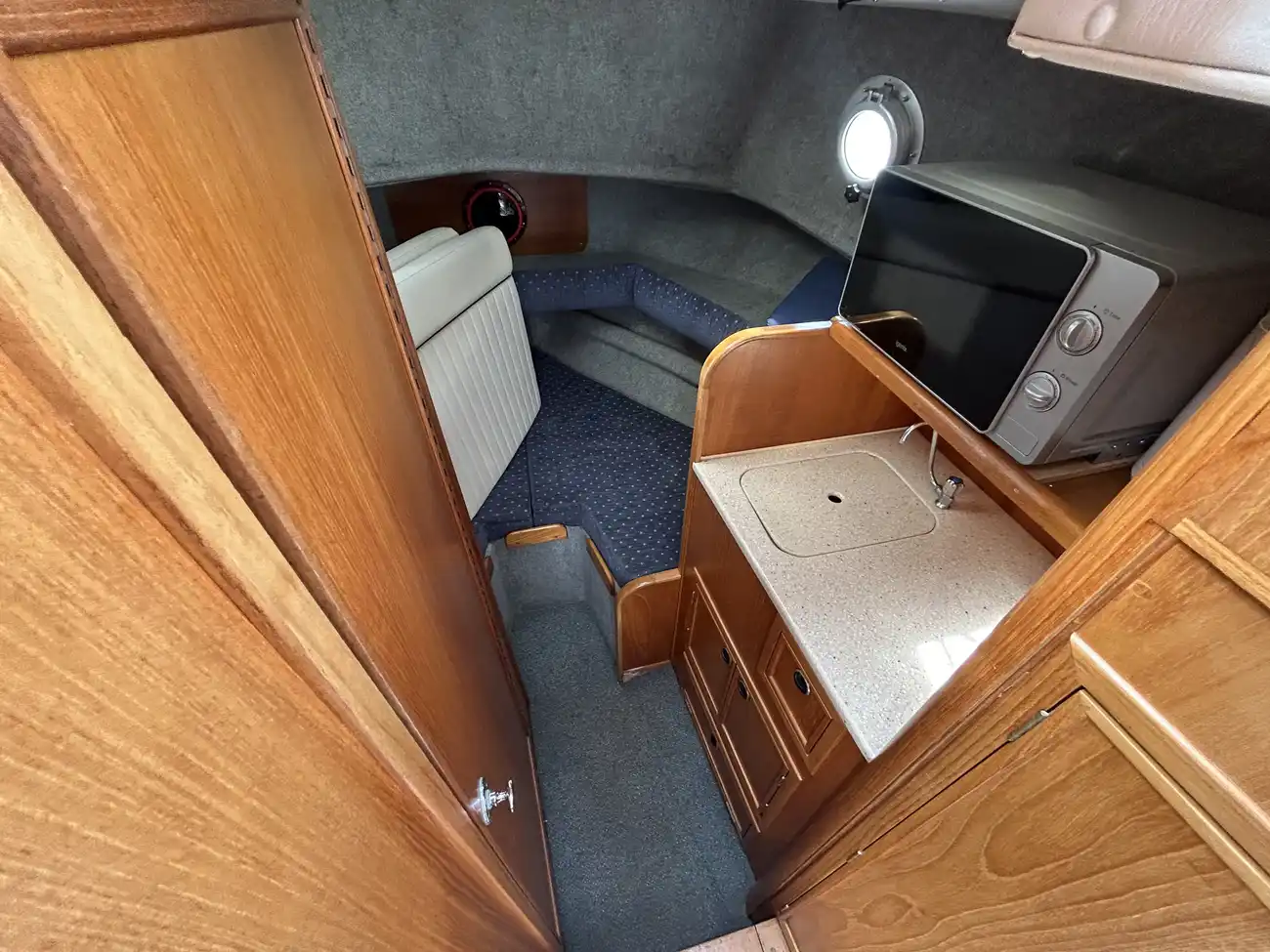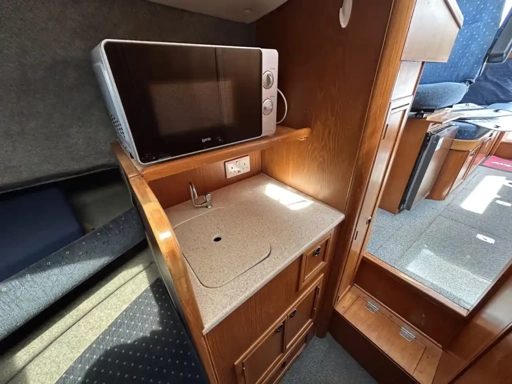 - Well-Equipped Galley: Microwave, sink, fridge, and storage.